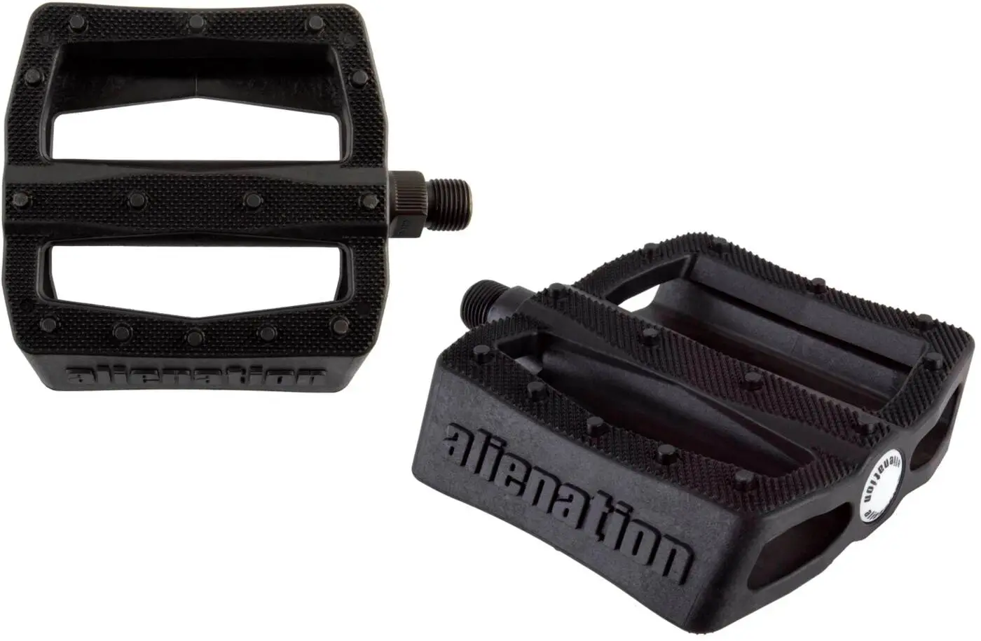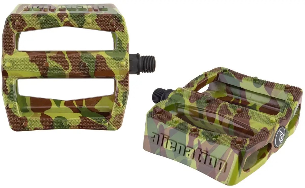 The Alienation Effects are freestyle BMX pedals with an axle diameter of 9/16″, making them compatible with two-piece and three-piece cranksets. They are made from a combination of nylon and fiberglass, which makes the pedals light, strong and capable of sliding like butter when you involve them in your grinds. For strength and durability, the spindle is made of chromoly steel, that will not be destroyed easily. Loose ball bearings for those who do not ride mud and dirt. Additionally, the dual concave shape of the platform will help locking your feet in for enhanced control.