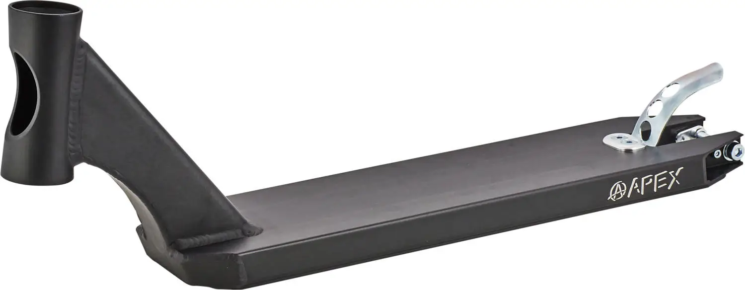 A top tier scooter deck from Apex scooters Australia, customized to the preferences of Darcy Evans, whose signature is placed on the right side of the neck. Made from a T6 Heat Treated Custom 6082 Australian Aluminum, CNC machined and laser etched, this deck combines strength, durability and design precision. Featuring rails for stable grinding, flat sides for finger whips and extra foot space, thanks to the headtube design.