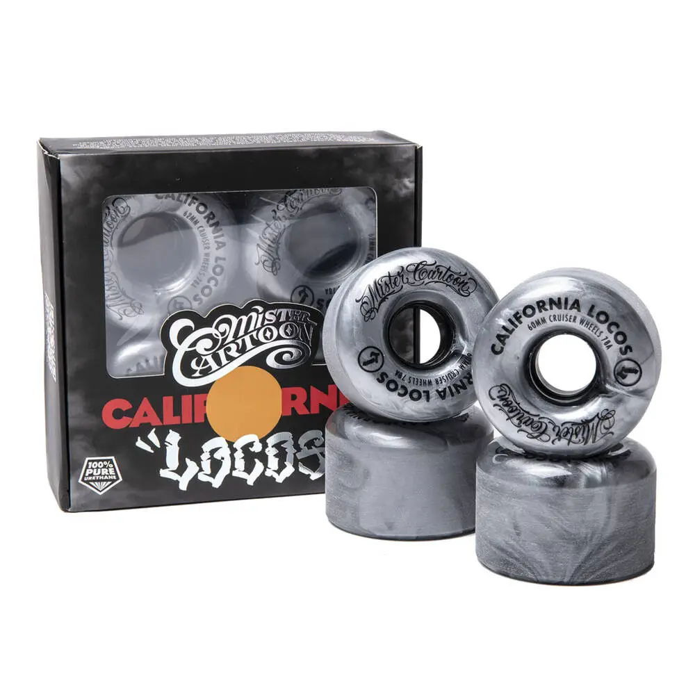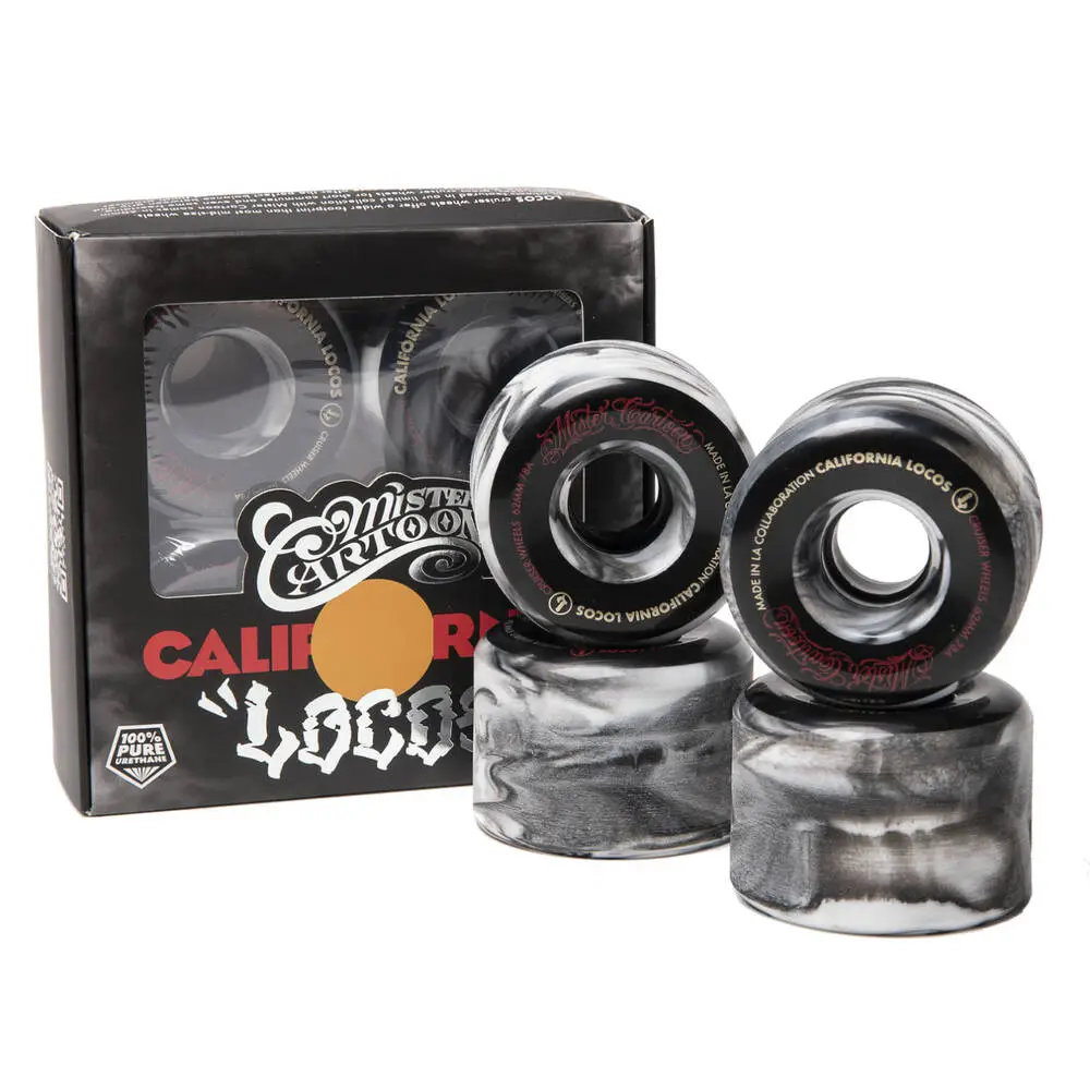 The 4-pack California Locos X Mister Cartoon Swirl Ink wheels are suitable for cruiser skateboards, longboards and surfskates. The quality of the urethane used for these wheels is durable and built for shredding. The medium medium-sized 60 and 63 mm wheels give you the versatility you look for when exploring different riding styles. Whereas the large 70 mm wheels are perfect for cruising and picking up speed.