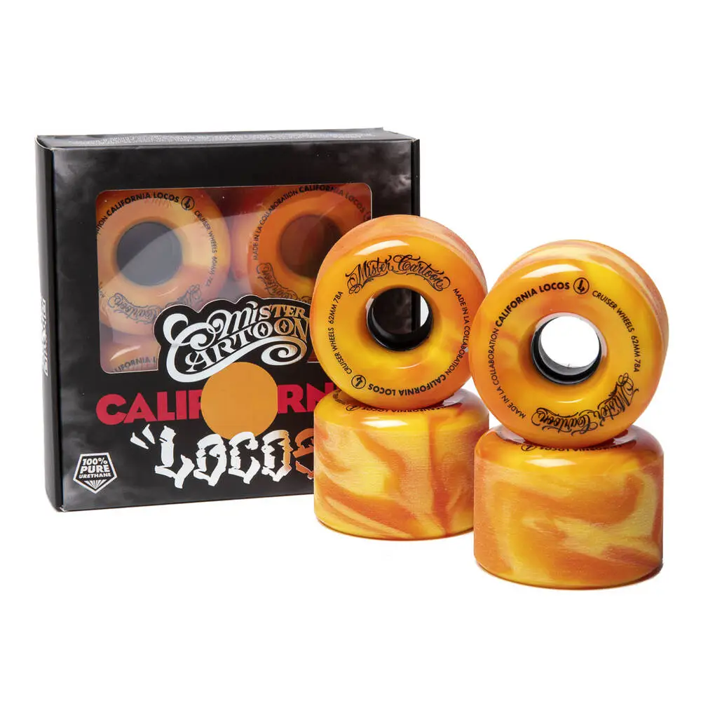 The 4-pack California Locos X Mister Cartoon Swirl Ink wheels are suitable for cruiser skateboards, longboards and surfskates. The quality of the urethane used for these wheels is durable and built for shredding. The medium medium-sized 60 and 63 mm wheels give you the versatility you look for when exploring different riding styles. Whereas the large 70 mm wheels are perfect for cruising and picking up speed.