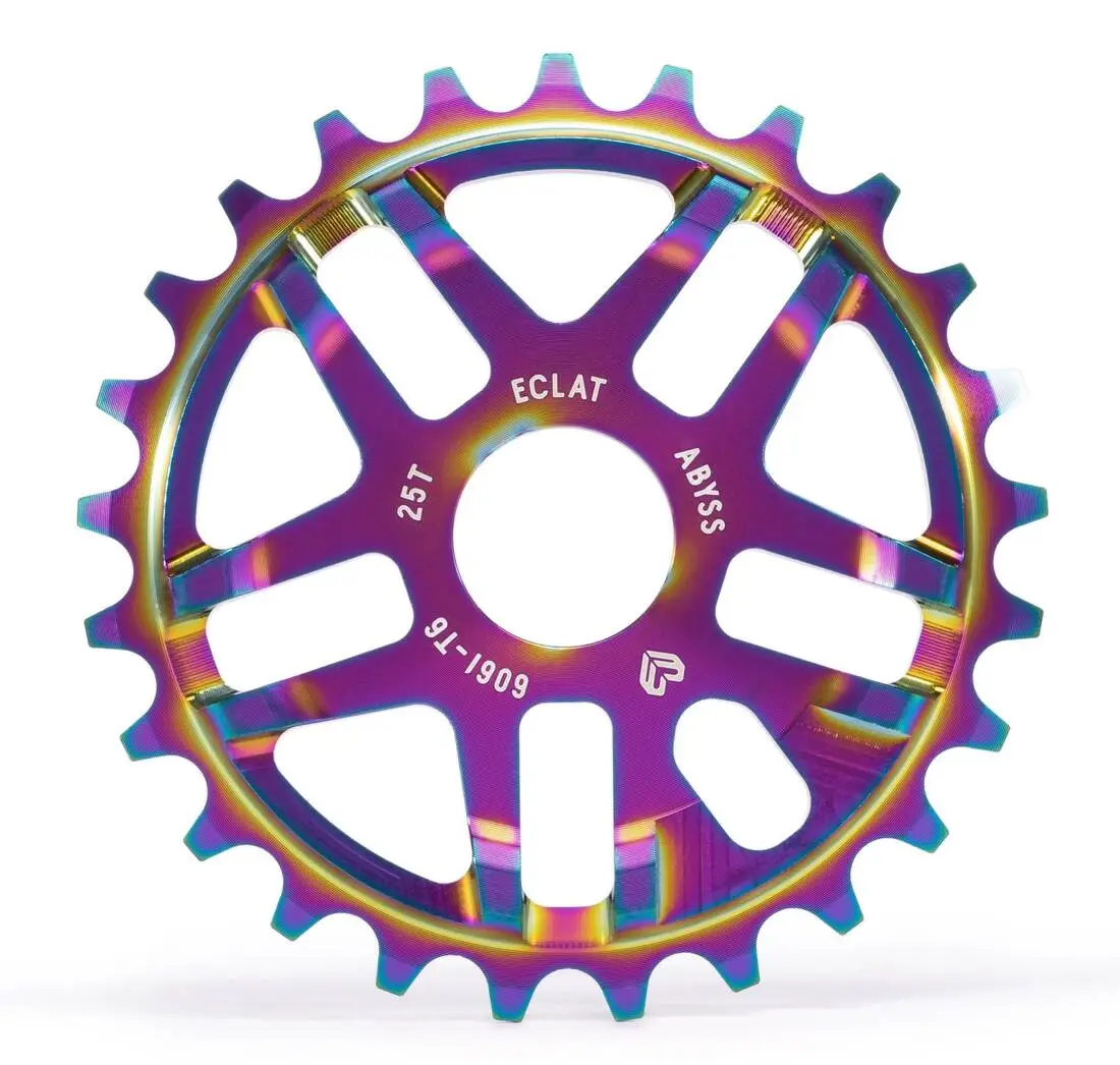 The Éclat Abyss is a high-performance BMX sprocket for freestyle bikes. It comes in 25T and 28T versions. Pick a larger sprocket with more teeth if you wish to gain higher top speeds. However, if you want more effortless pedaling and better acceleration, then the smaller sprocket should be your choice. This Éclat sprocket is designed with a 24mm bore and a bolt drive hole, but thanks to the included adapters, it is suitable for 19mm and 22mm mounting as well.