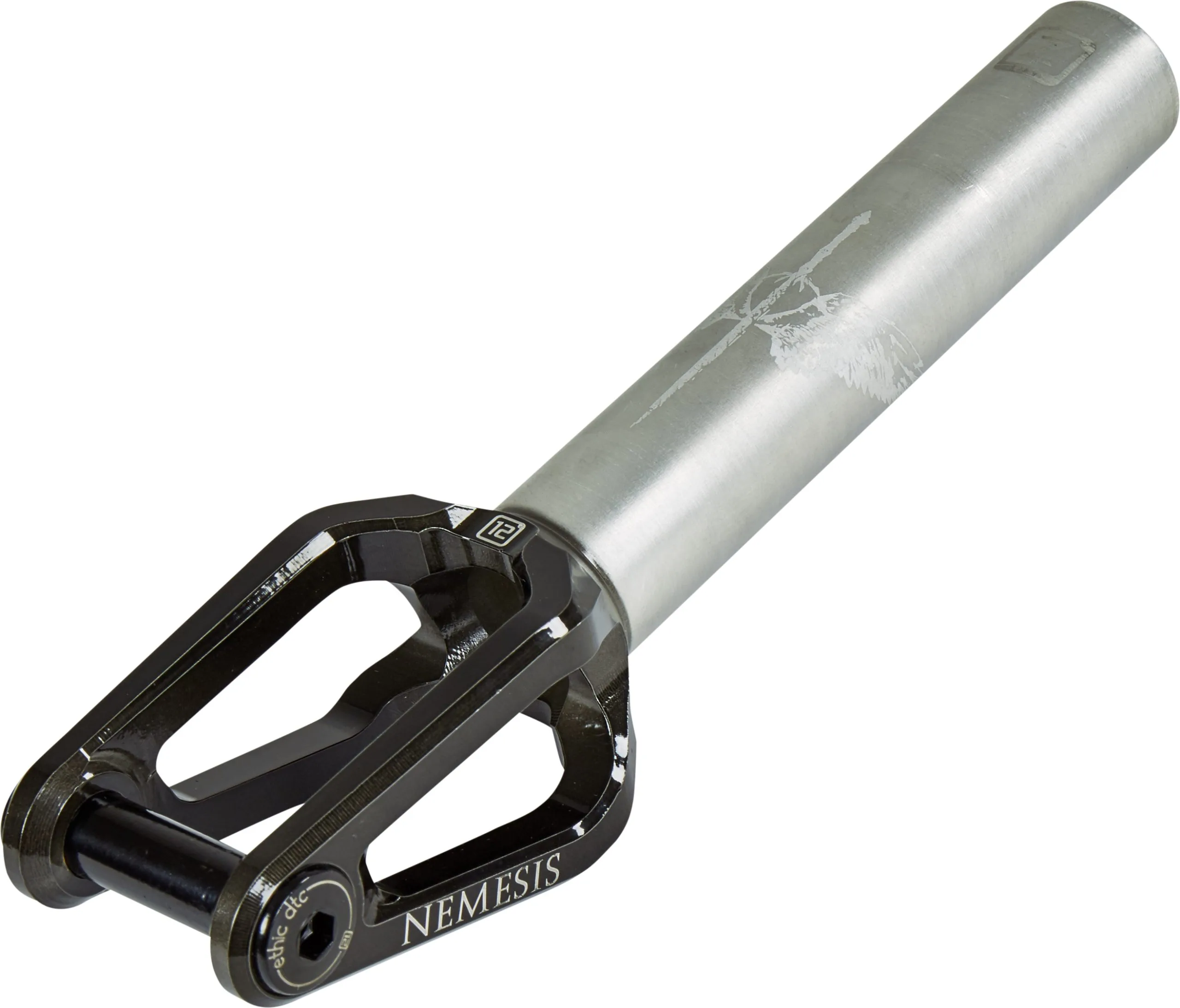 The Nemesis pro scooter fork is the evolution of the popular Merrow fork from Ethic. Combined with the “12 New Standard” range you get a fork that is ready to run with the 12mm axle, 30mm wide wheels and special 6001 bearings.