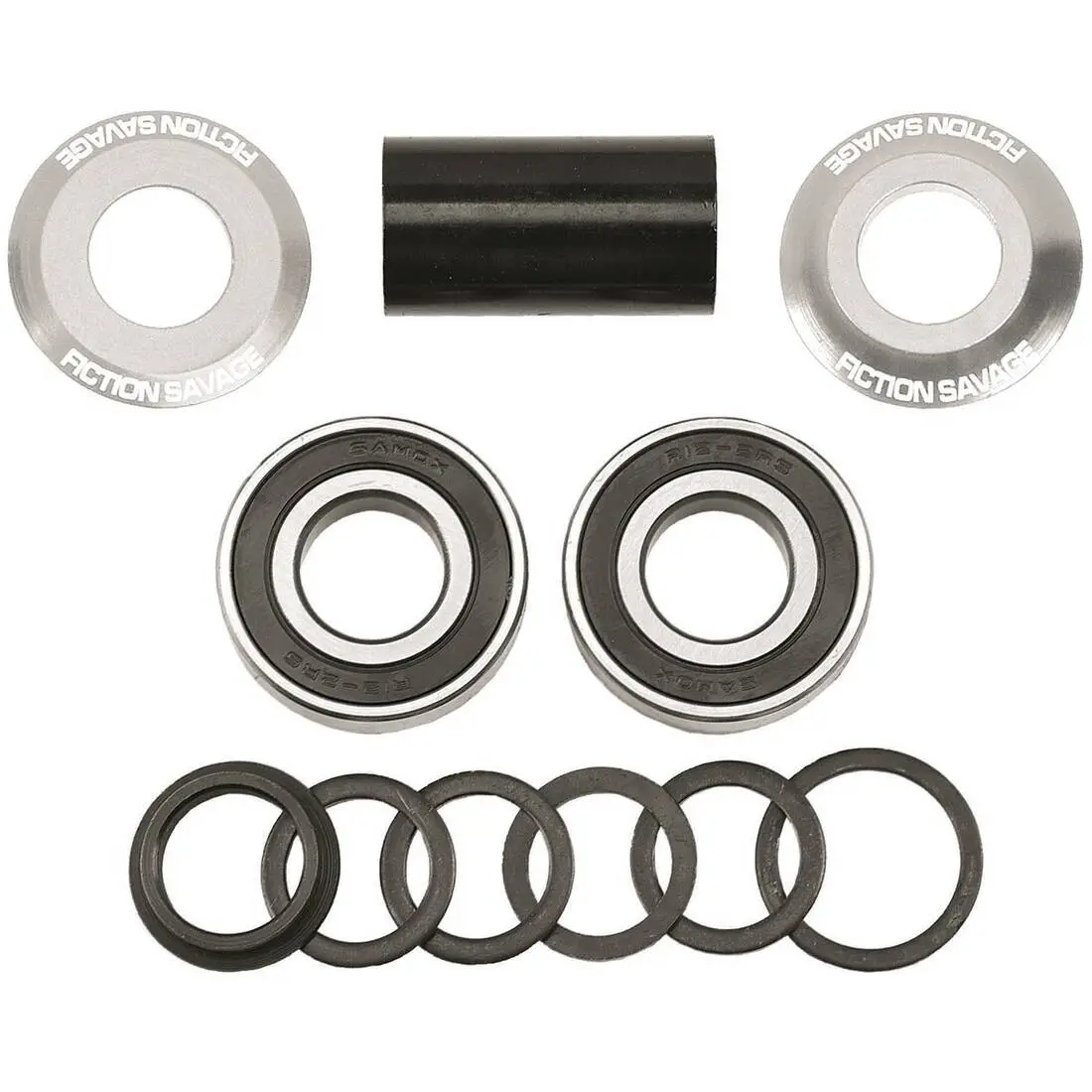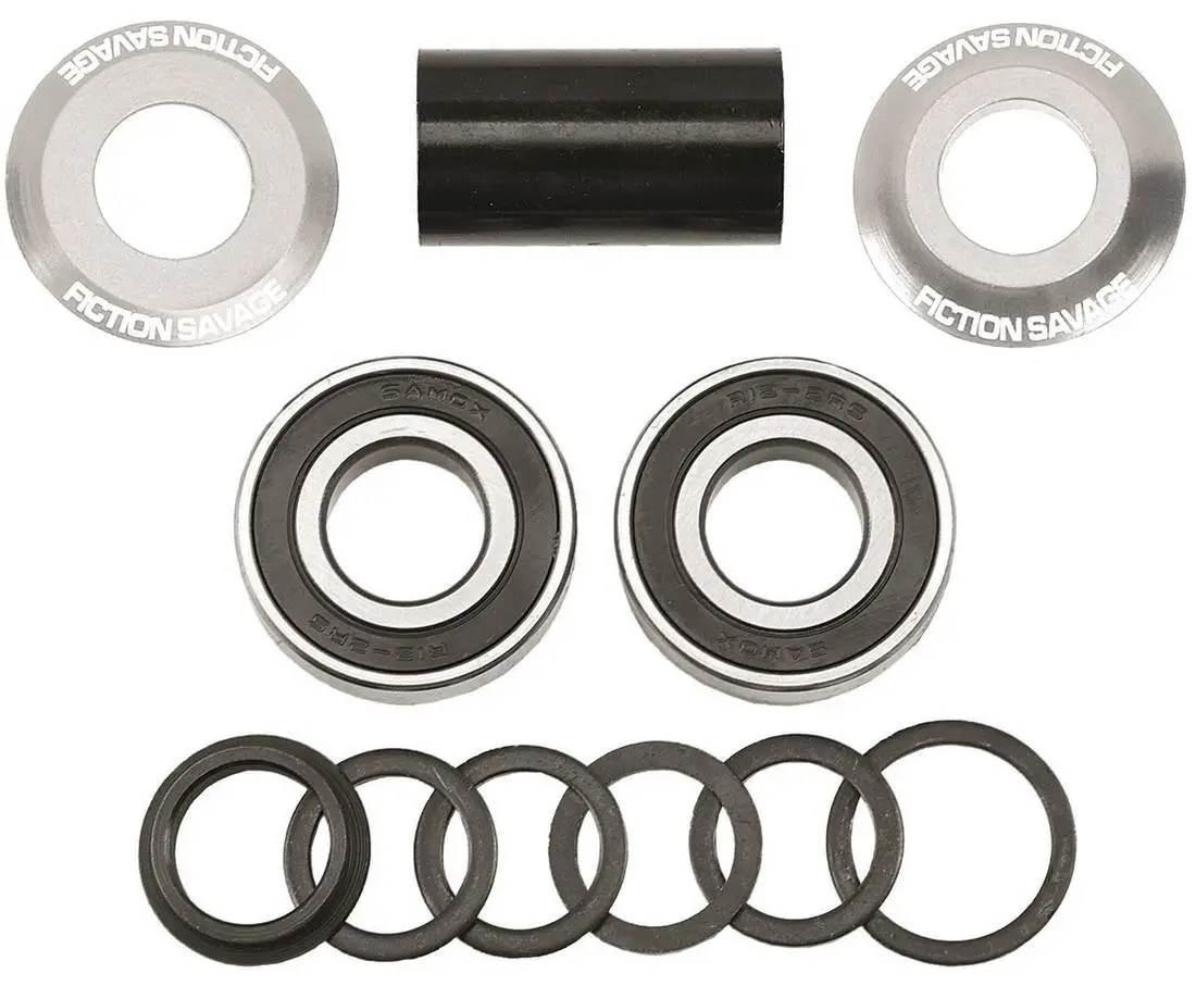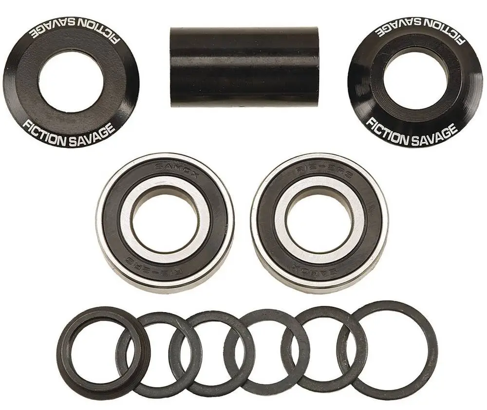 Savage Mid Sealed Bottom Bracket by Fiction BMX features CNC machined 6061 Alloy spacers and precision sealed bearings. It comes with an internal spacer and is available for both 19mm or 22mm spindles.