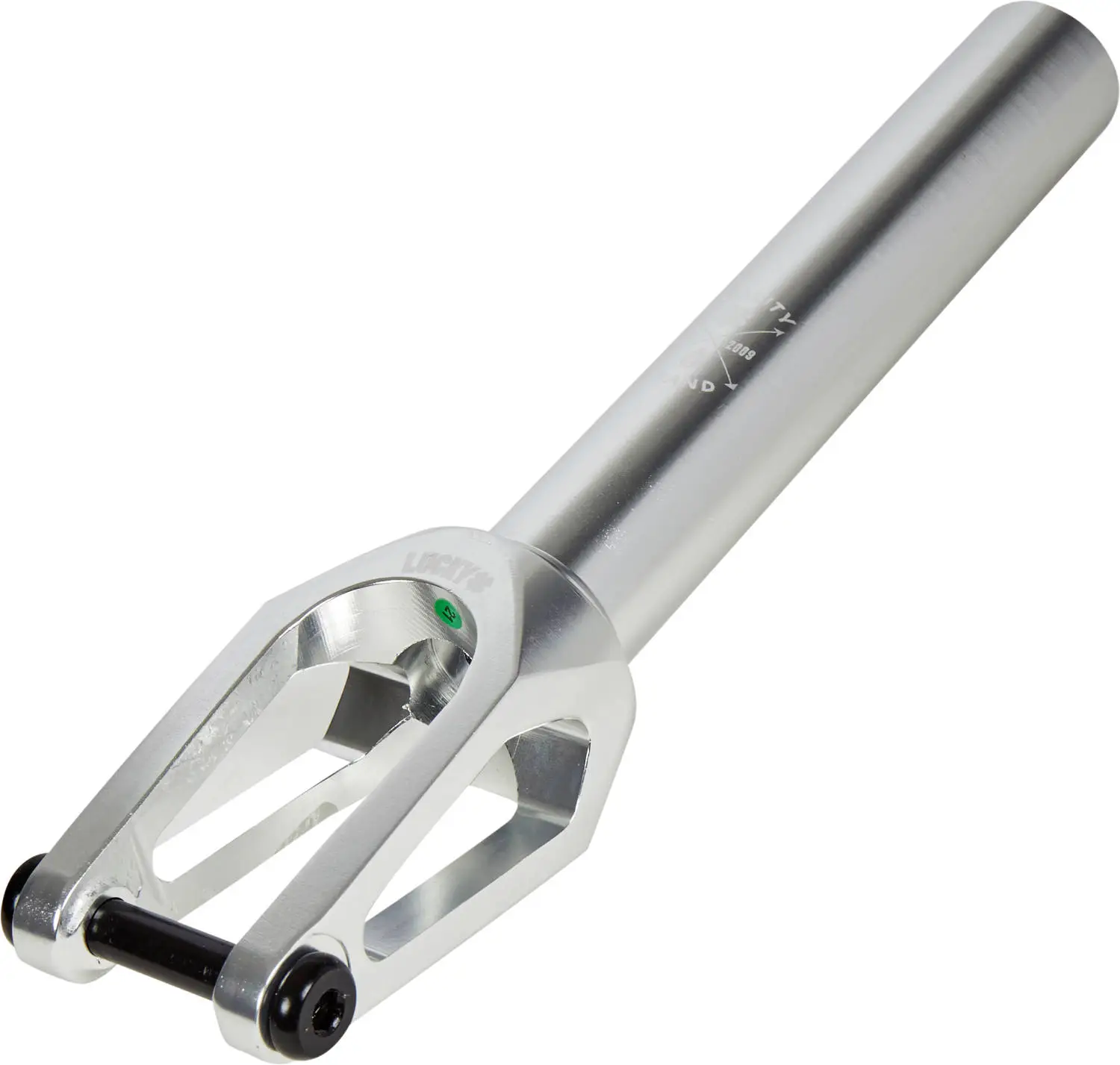The Huracan fork is compatible with both 100mm, 110mm, and 120mm wheels and in this version, it is compatible actually with most compression types. A cool feature of this second edition Huracan fork is the top-cap/starnut. With its bolt-like construction, you can leave it in place and use the fork for SCS/HIC compression type. Or unscrew it and the fork can now be used with ICS compression.