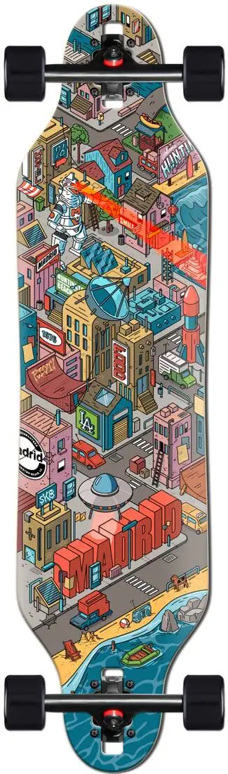 The Madrid Drop-Thru longboard is a performance machine and a super durable board that will support your longboarding progression with every push. It enables you to explore the streets and hills in a whole new and fun way. The deck on this longboard setup features cut outs. Cutouts on longboard decks are awesome because they make room for bigger wheels and enable a low and stable setup that isn’t prone to wheel bites. Being already fully assembled with all the right parts, this complete board is pretty much ready to ride right out of the box.