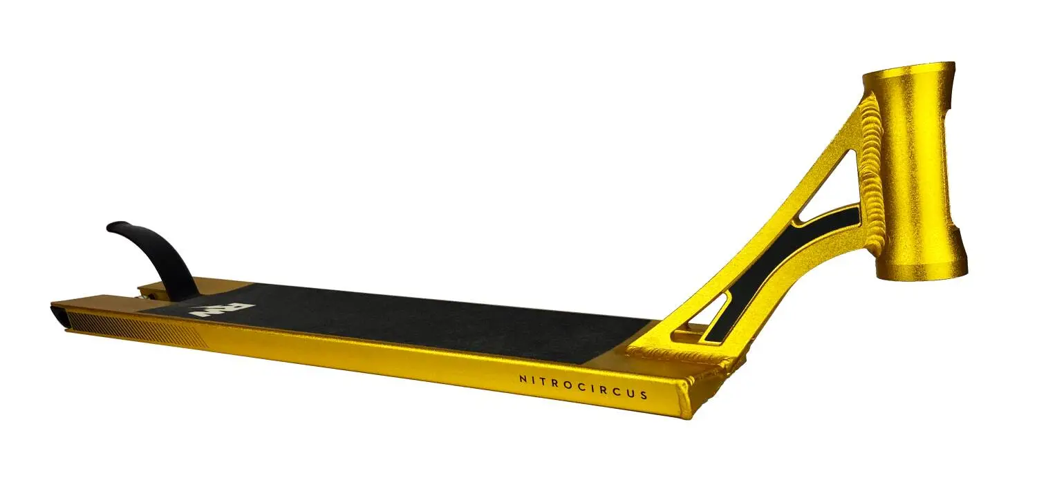 The Nitro Circus RW 560 is a well-performing pro scooter deck, and it is made from light Aluminum material. Get ready to conquer the streets thanks to the box-cut shape of this deck, which offers you stable grinds, more foot space for landings and no need for pegs. This Nitro Circus scooter deck is compatible with 100mm, 105mm, 110mm, 115mm and 120mm wheels.