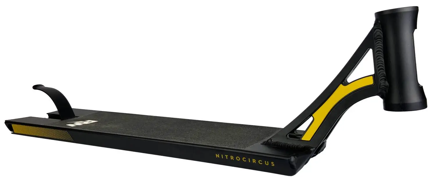 The Nitro Circus RW 560 is a well-performing pro scooter deck, and it is made from light Aluminum material. Get ready to conquer the streets thanks to the box-cut shape of this deck, which offers you stable grinds, more foot space for landings and no need for pegs. This Nitro Circus scooter deck is compatible with 100mm, 105mm, 110mm, 115mm and 120mm wheels.