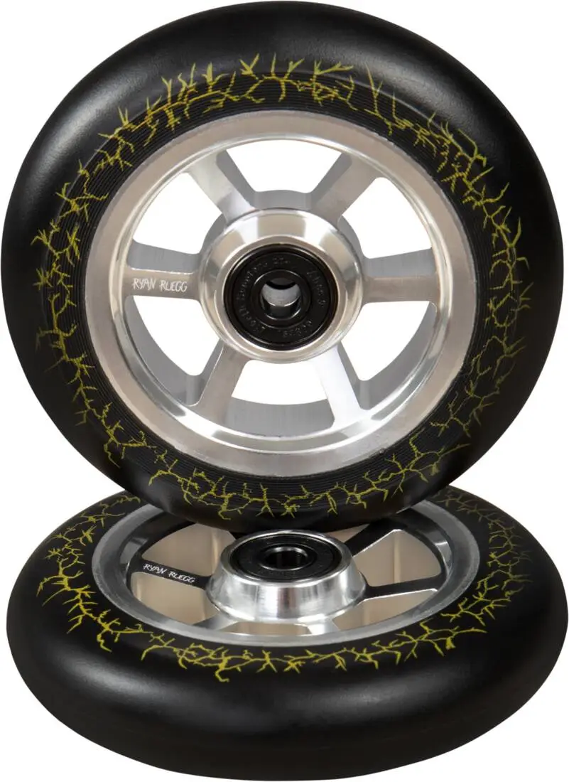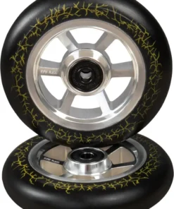 This is the Ryan Ruegg Signature pro scooter wheel set from the brand North. Having a spoked core that is made of aluminum, the wheel is classic looking and it has all the right properties such as low weight and durability. The grippy PU formula with high rebound and good traction for all your tricks is ready to be taken to the street or the skatepark. Moreover the durometer of 88A attests to the wheel’s perfect mix of grip and speed, making it great for both street and park riding. North has designed the wheel with a round profile to give you a stable wheel with less friction and thereby adding speed to your performances.
