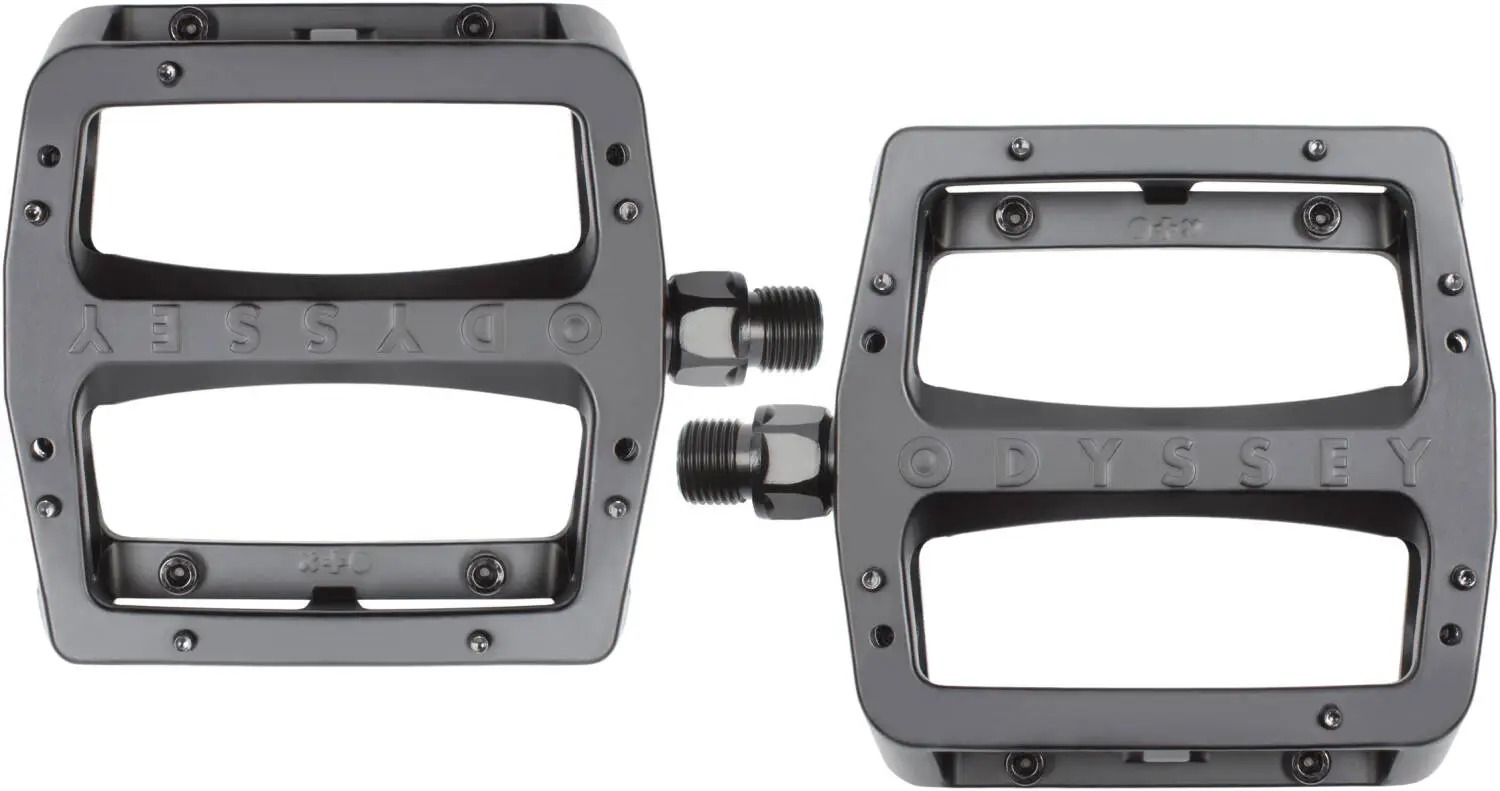 The Grandstand V2 Alloy BMX Pedals by Odyssey comes in a slim profile with a wide and concaved platform, providing a superb and comfortable stance. This version is made from solid alloy material and features an updated bushing system that reduces axial movement, adding stability to your ride.