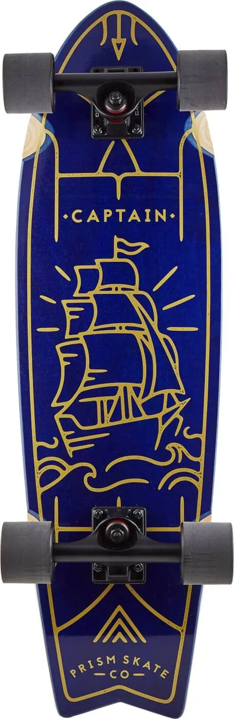 The Captain is a cruiser skateboard from the Prims Skateboard Company. It has a shape that makes it perfect for tearing up boardwalks and urban environments. Carvy and with enough kick in the tail to pop a flip trick or two.