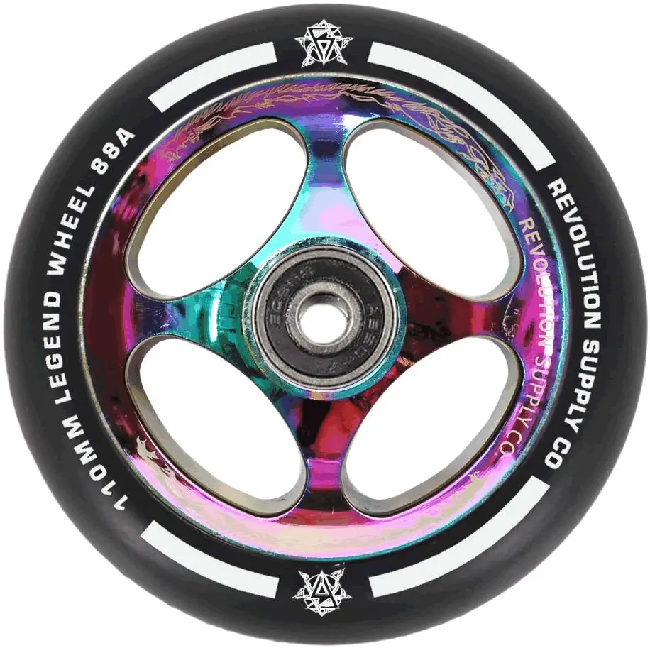 The Legend wheel by Revolution Supply is designed, developed, and tested by pro riders in order to ensure a pro-rider worthy wheel. It’s based on spoked alloy core and is made from a very firm PU-rubber, that is less likely to dehubbing and chucking.