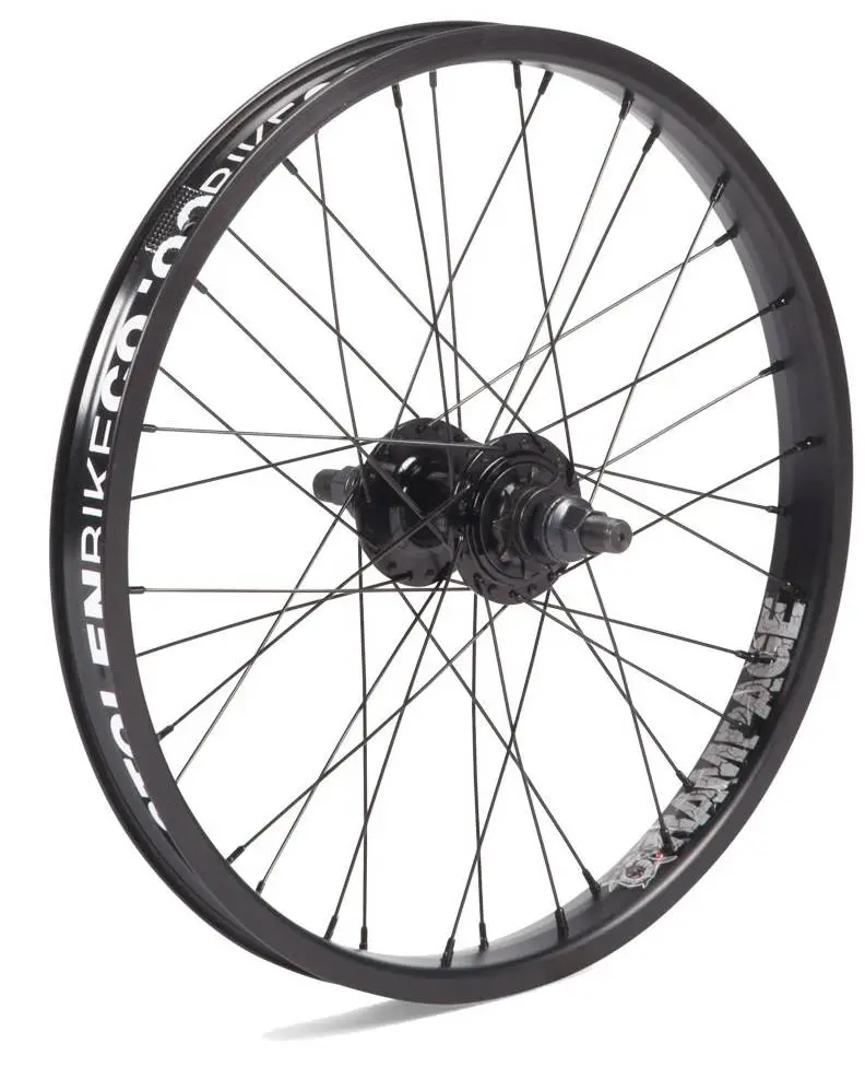 It comes with a fully sealed cassette hub, laced by hand, to the 36 holes Rampage double-wall rim. This results in a long-lasting rear wheel that can withstand some hard impacts. Furthermore, it comes with a Chromoly 9T right-hand driver and standard 14mm Chromoly axles, ready for peg installation.