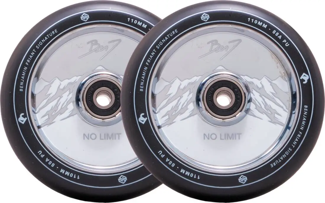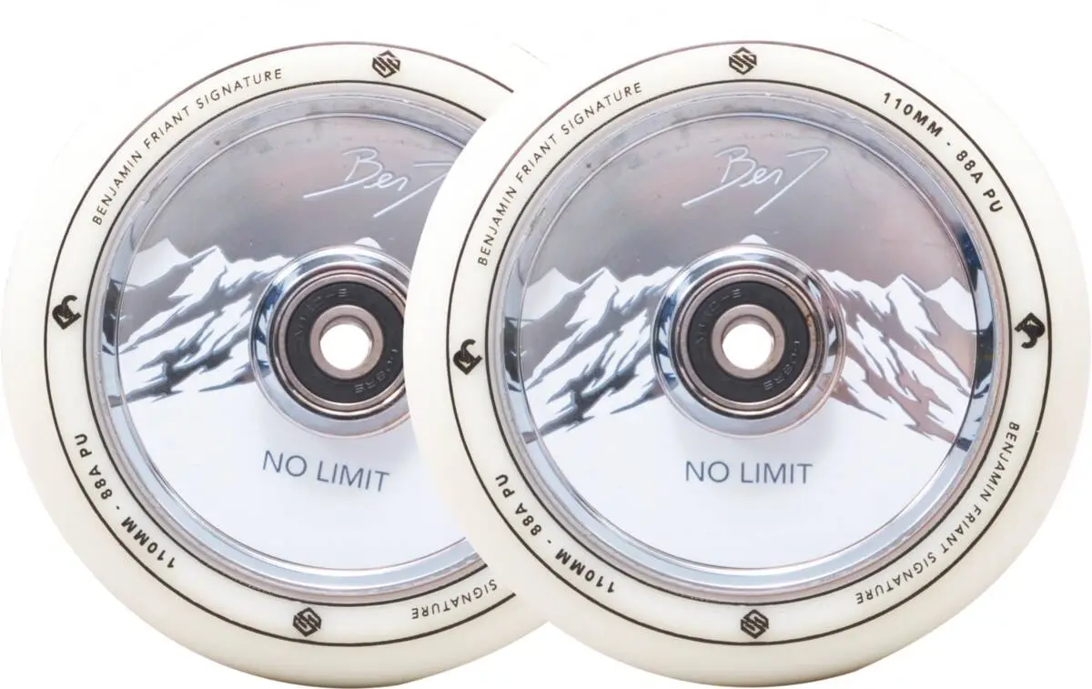 This is the Benj No Limit pro scooter wheel set from the brand Striker. Having a hollow core that is made of 6061 aluminum, this wheel has a very sturdy and light construction, leaving you no excuse to stay on the ground. Moreover the durometer of 88A attests to the wheel’s perfect mix of grip and speed, making it great for both street and park riding. Striker has designed the wheel with a round profile to give you a stable wheel with less friction and thereby adding speed to your performances.