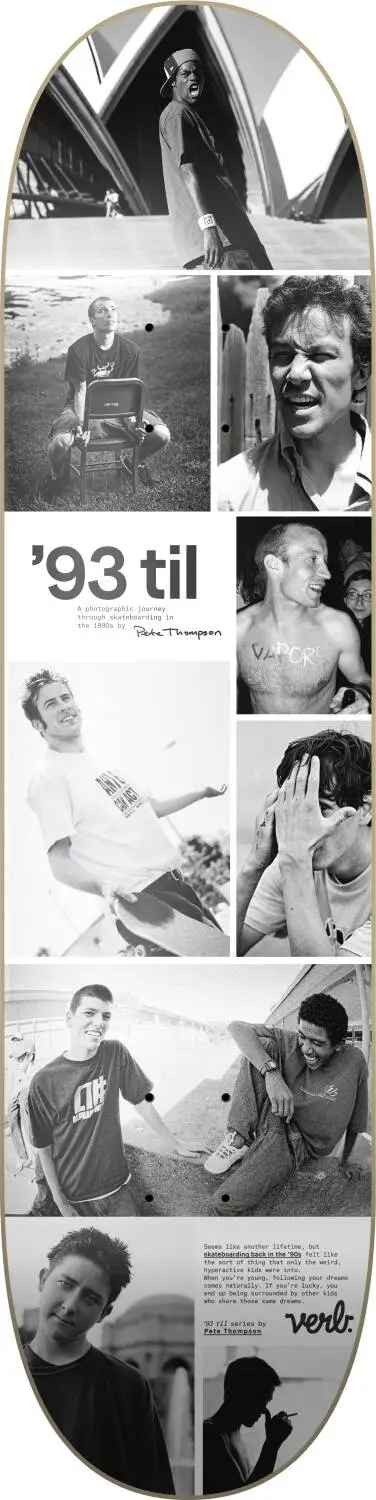 The 93 Til Collage Skateboard Deck by Verb takes you on a nostalgic journey back to the ’90s, where skateboarding was not socially accepted and more associated with hip hop culture than an actual sport.
